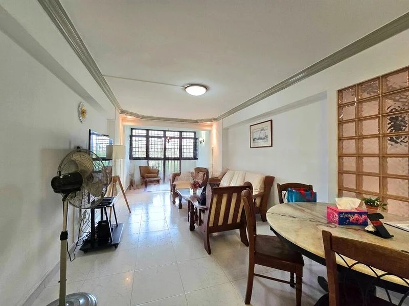 Step into this inviting HDB flat at 83 Whampoa Drive, where abundant natural light floods the living and dining area, highlighting the elegant marble-top dining table and cozy wooden sofa set. The glass block wall partition adds a unique touch, creating an airy ambiance that feels both warm and welcoming, perfect for family gatherings or quiet evenings at home.