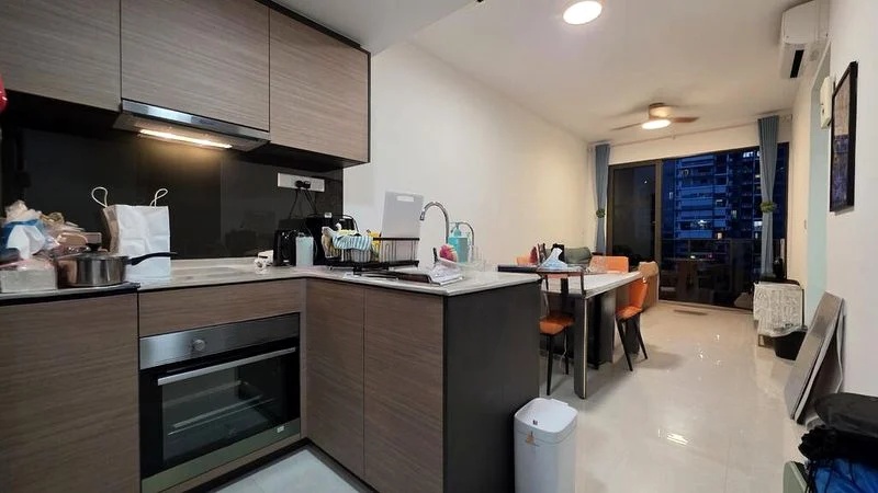 The heart of the home is the stylish island kitchen, featuring sleek wooden cabinetry, a black backsplash, and built-in appliances including an integrated oven and stainless steel refrigerator. The spacious living room is perfect for relaxation, complemented by a ceiling fan and split-unit air conditioning. Both bedrooms boast built-in floor-to-ceiling wardrobes, while the bathrooms showcase contemporary finishes with dark textured wall tiles and modern vanities.