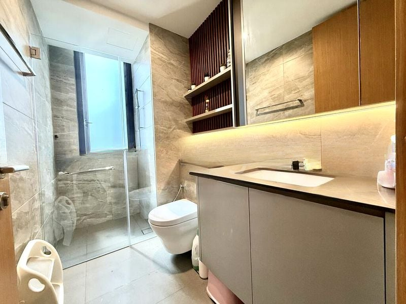 Step into a world of elegance and comfort as you enter this beautifully designed unit at The Trilinq. Bathed in abundant natural light, the modern minimalist ambiance is accentuated by floor-to-ceiling windows that frame breathtaking views of the city skyline. The sophisticated finishes, including wood-slat feature walls and cove lighting, create an inviting atmosphere that feels both luxurious and homely.