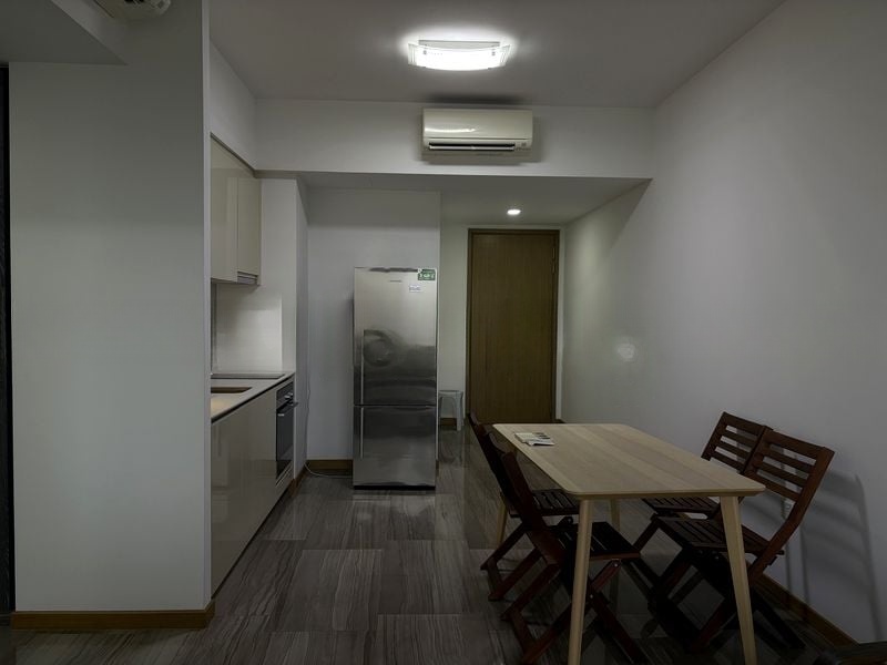 This well-maintained 2-bedroom, 2-bathroom condo features an open-concept layout that maximizes space and comfort. The living area flows effortlessly into the dining space, complemented by polished tile flooring. The kitchen boasts glossy cabinets, an induction hob, and integrated appliances, making it a chef's delight. Each bedroom is equipped with built-in sliding wardrobes and large windows, ensuring a serene retreat.