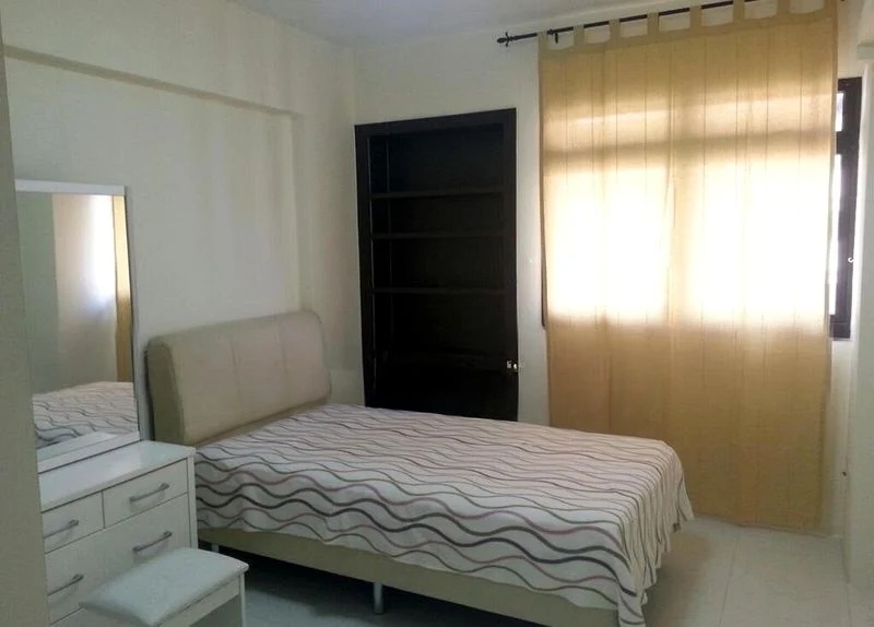 This well-maintained unit features three comfortable bedrooms, including a master suite with a dark wood platform bed and a full-height built-in wardrobe with frosted glass panels. The dedicated foyer area, complete with a shoe cabinet, adds practicality to the design. Enjoy seamless living with an integrated dining space, perfect for family gatherings or entertaining friends.