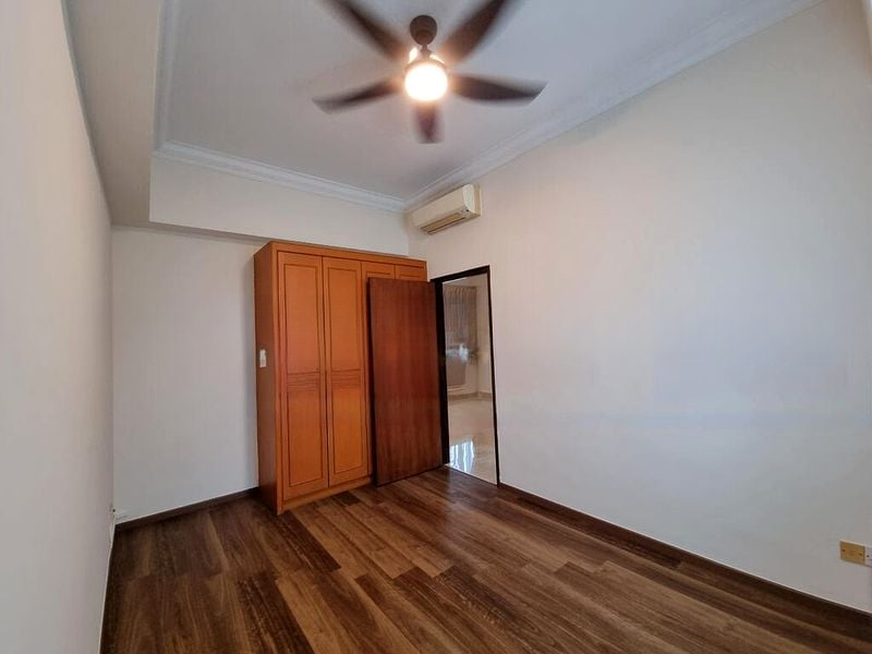 This spacious 3-bedroom unit features an open-concept living and dining area, perfect for entertaining. The kitchen boasts two-tone cabinetry and ample storage, while the bedrooms are adorned with wood-look laminate flooring and built-in wardrobes. Each room is fitted with ceiling fans and split-unit air conditioning, ensuring comfort throughout the year. The bathrooms are elegantly designed with marble-look tiles and modern fixtures, enhancing the overall appeal of this home.