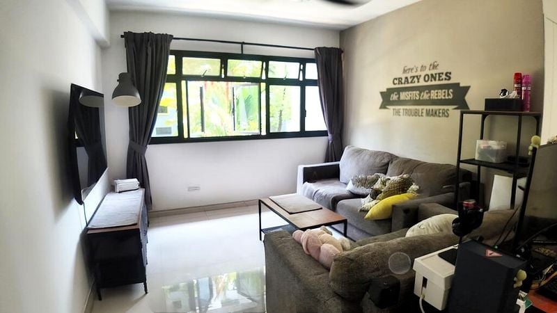 Step into this well-maintained 3-bedroom flat at 45 JLN TIGA and be greeted by a functional yet modern ambiance. The moderate natural light enhances the space, showcasing the dark wood feature wall in the bedroom and the sleek finishes throughout. The galley kitchen, equipped with a gas stove and range hood, invites culinary creativity, while the built-in wardrobes with drawers provide both style and practicality.