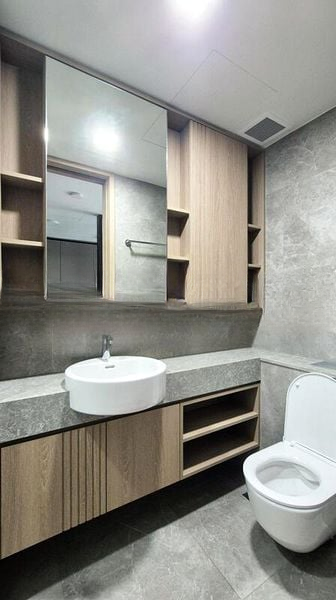 This thoughtfully designed unit features a glass-enclosed kitchen with stone-look countertops and wood-look cabinetry, perfect for culinary enthusiasts. The spacious living room seamlessly connects to the balcony through sliding glass doors, while the bedrooms boast light wood-look flooring and neutral white walls, enhancing the minimalist aesthetic. Each bathroom is equipped with modern fixtures, including a vessel sink and wall-hung toilet, ensuring comfort and style.