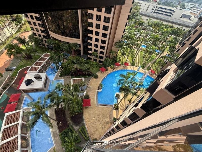 Step into this beautifully maintained unit at Heritage View, where abundant natural light floods the space, creating a bright and airy ambiance. The elegant marble flooring in the living area complements the large windows that frame picturesque views of the pool, greenery, and city skyline, making every moment spent here a visual delight.