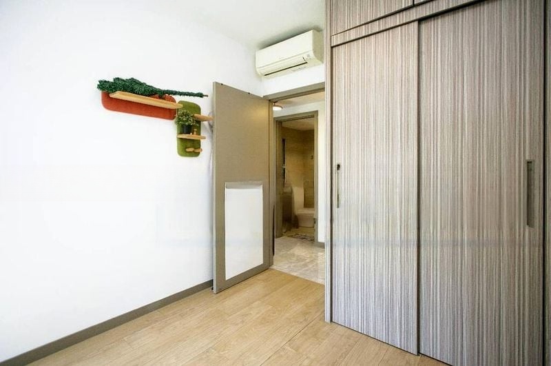 This well-designed 3-bedroom, 2-bathroom unit features a master bedroom with a large window framing the urban landscape, complemented by dark wood-look flooring. The kitchen boasts a galley layout with built-in cabinets and wood-look laminate finishes, while the modern bathroom showcases a luxurious rain shower and vessel sink. Enjoy the convenience of a utility area equipped with a washing machine and ample storage.