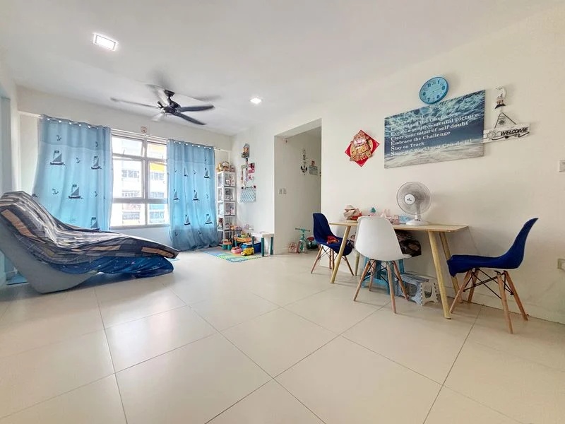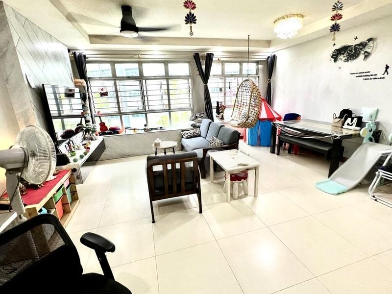 Step into a bright and airy sanctuary at 432C Yishun Ave 1, where abundant natural light floods through large windows, illuminating the polished concrete-look flooring. The open-plan living and dining area invites you to unwind, while the minimalist aesthetic creates a serene ambiance, perfect for modern living.