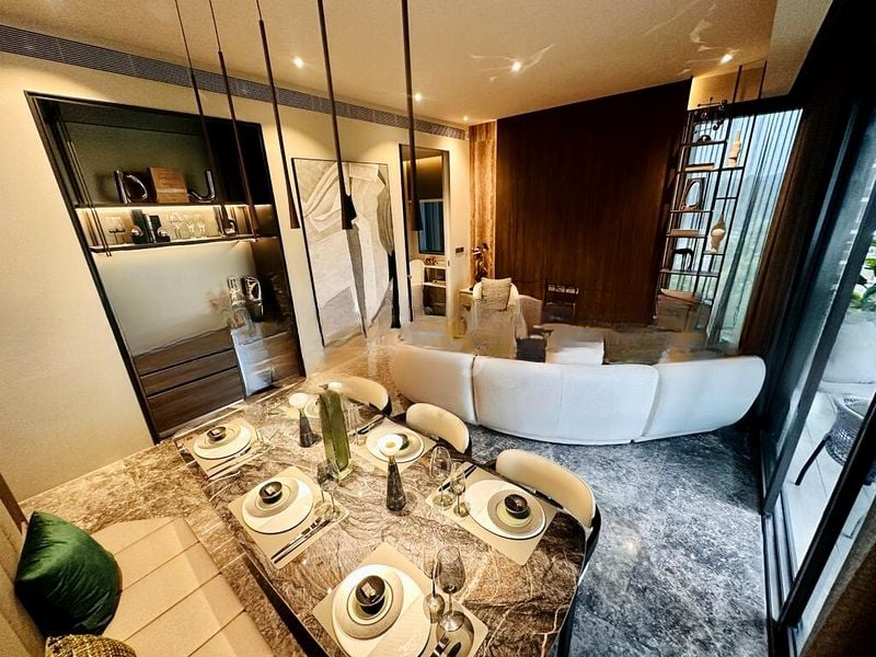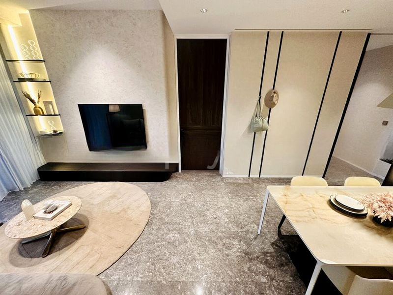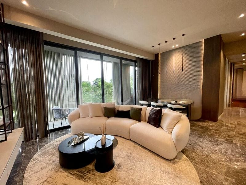Step into a world of modern elegance as you enter this brand-new designer unit at 19 Nassim. Bathed in abundant natural light, the open-concept living space features exquisite marble flooring and floor-to-ceiling windows that frame breathtaking views of the city skyline and lush greenery. The minimalist ambiance is enhanced by wood-paneled walls and a textured feature wall, creating a serene yet sophisticated atmosphere.