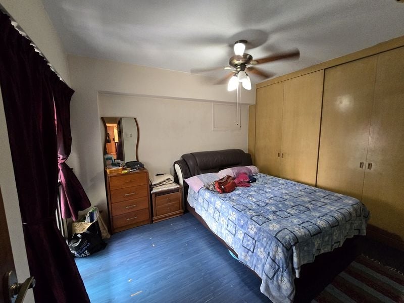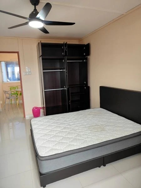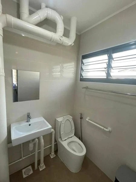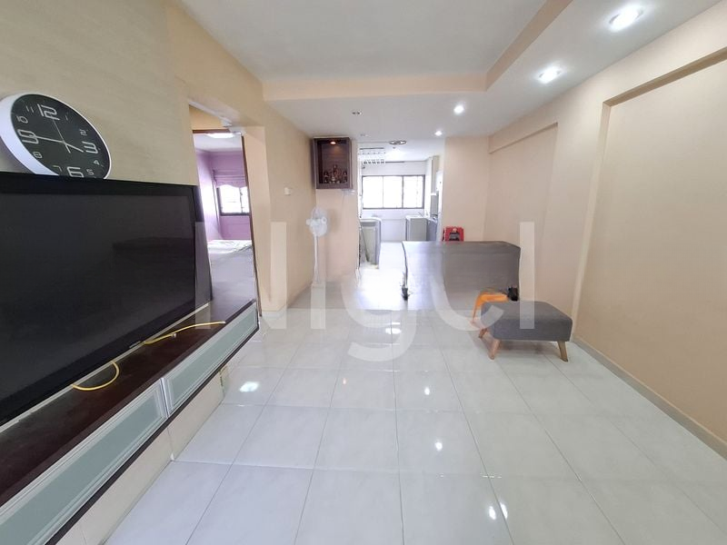 Step into this well-maintained HDB flat and be greeted by a simple yet functional ambiance, accentuated by large format floor tiles and a bright, airy feel. The dining area features a round white table surrounded by colorful modern chairs, creating an inviting space for family gatherings. Natural light filters through, enhancing the warmth of the dark wood internal doors and the cozy atmosphere.