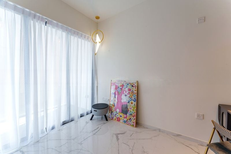 Step into a world of elegance as you enter this beautifully renovated 1-bedroom unit at The Gazania. Bathed in natural light, the living room boasts stunning marble-look floor tiles and floor-to-ceiling windows that frame picturesque views of the swimming pool and lush greenery. The ambiance is bright and airy, enhanced by a designer bird pendant light that adds a touch of sophistication.
