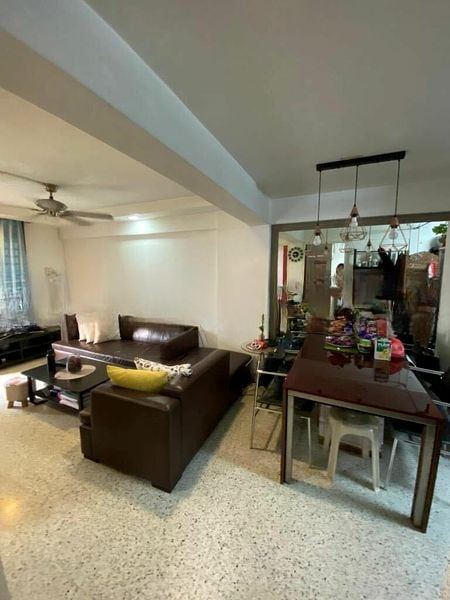 Step into a warm and inviting atmosphere where classic parquet flooring meets traditional terrazzo in the living area, creating a cozy ambiance that feels like home. Natural light filters through the windows, enhancing the lived-in charm of this well-maintained unit, while modern pendant lighting adds a touch of elegance to the dining space.