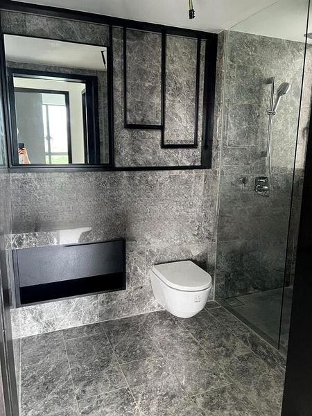 This thoughtfully designed 2-bedroom unit features an open concept living area that seamlessly connects to the kitchen, adorned with black minimalist cabinetry and under-cabinet lighting. The bathroom is a sanctuary of luxury with its wall-hung toilet, rain shower, and stylish grey marble-look tiles. Each room is meticulously crafted, from the dark wood-look flooring in the bedroom to the elegant finishes throughout, ensuring a sophisticated living experience.