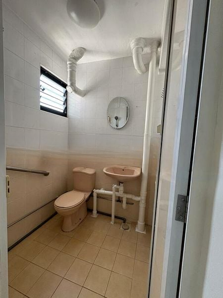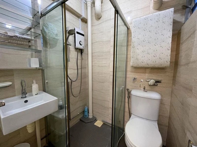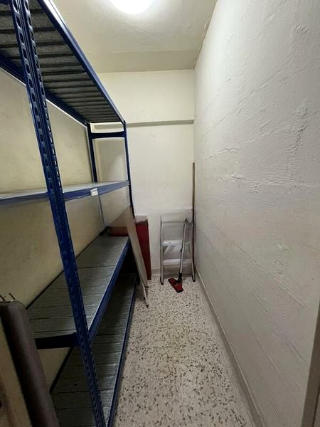 This unit features a dedicated storage room with heavy-duty metal racks, perfect for organizing your belongings. The bathroom retains its original charm with two-tone tiling and an efficient layout, while the utility area offers practicality with a washing machine point and additional wash basin. With a floor area of 785 sqft, this home is designed for comfortable living.