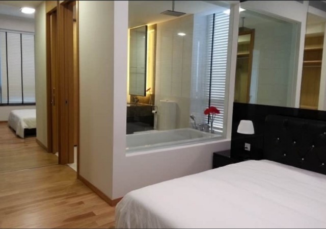 This well-maintained 1-bedroom plus study layout features a stunning open-concept kitchen with a white island counter and modern cabinetry, perfect for entertaining. The master bedroom boasts wooden flooring and a large window that frames the urban landscape, while the master bathroom is a luxurious retreat with marble finishes and a relaxing bathtub. Additional highlights include a second bathroom with sleek black vanity and a study with custom metal shelving, catering to both work and leisure.