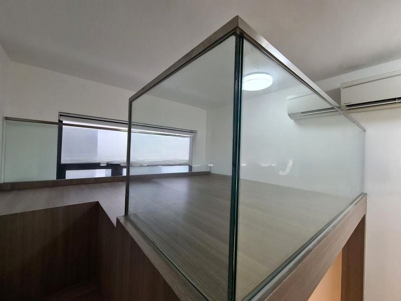 Step into this beautifully renovated loft unit and be greeted by an abundance of natural light that fills the space, accentuating the modern minimalist aesthetic. The floor-to-ceiling windows offer stunning urban views, while the glass balcony railing invites you to enjoy the greenery and vibrant surroundings. The ambiance is bright and airy, creating a welcoming atmosphere from the moment you enter.