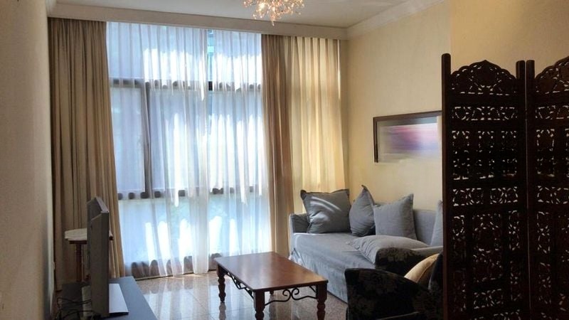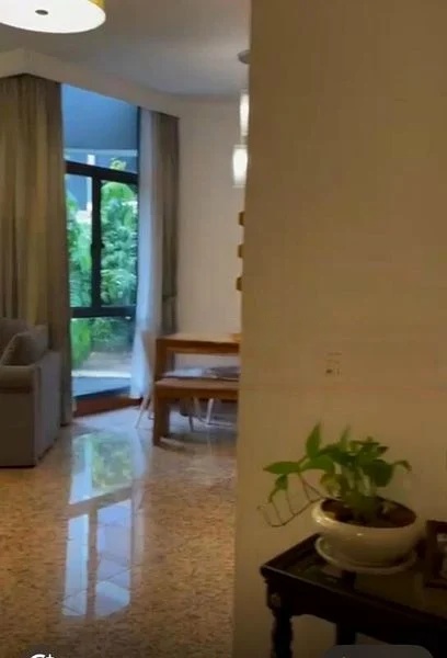Step into a bright and functional living space where modern elegance meets comfort. The well-maintained unit features terrazzo flooring that flows seamlessly into the living room, complemented by an L-shaped grey sofa and a stylish TV console. Floor-to-ceiling windows invite natural light and offer a refreshing view of the swimming pool and urban landscape, creating a serene ambiance.