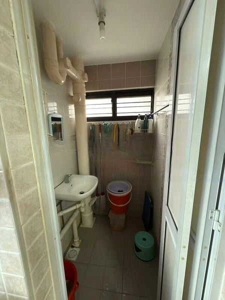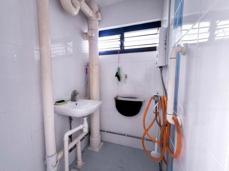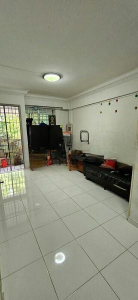 Step into a world of nostalgia as you enter this charming HDB flat, where vintage patterned floor tiles greet you at the door, complemented by a simple yet functional ambiance. Natural light filters through the windows, illuminating the white walls and enhancing the spacious feel of the living room, complete with a ceiling fan for added comfort.