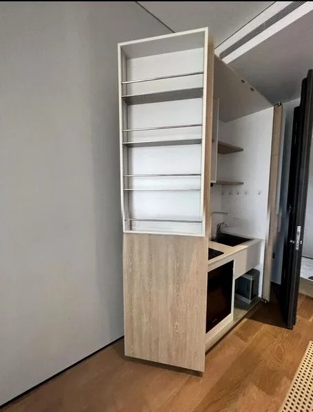 This compact yet thoughtfully designed unit features a stylish kitchenette equipped with a Smeg oven and induction hob, perfect for culinary enthusiasts. The open layout seamlessly connects the dining/study area, adorned with a long dark table and designer wooden chairs, to the inviting bedroom that offers direct access to the wooden-decked balcony. The bathroom showcases elegant marble-look tiles and a walk-in shower, enhancing the overall luxury feel of the space.