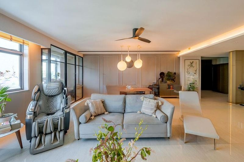 This exquisite unit features four well-appointed bedrooms, including an expansive master suite, and a massive 71 sqm living area perfect for entertaining. The dining room boasts a stunning live-edge wooden table, complemented by designer globe pendant lights, while the bathrooms showcase elegant white subway tiles and luxurious rain showers. The custom wood paneling and warm accent lighting throughout the flat elevate the overall aesthetic, making it a true sanctuary.