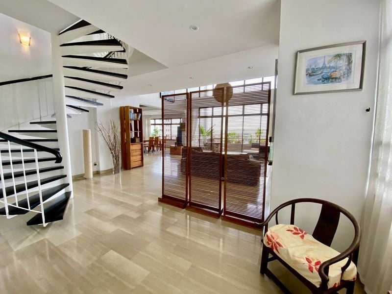 Step into a world of elegance as you enter this stunning unit at Kensington Park Condominium. Bathed in natural light, the open-concept living area features double-volume ceilings and floor-to-ceiling windows that frame unobstructed panoramic views of the city skyline and lush landed housing estates. The marble flooring adds a touch of sophistication, creating a bright and airy ambiance that invites relaxation.