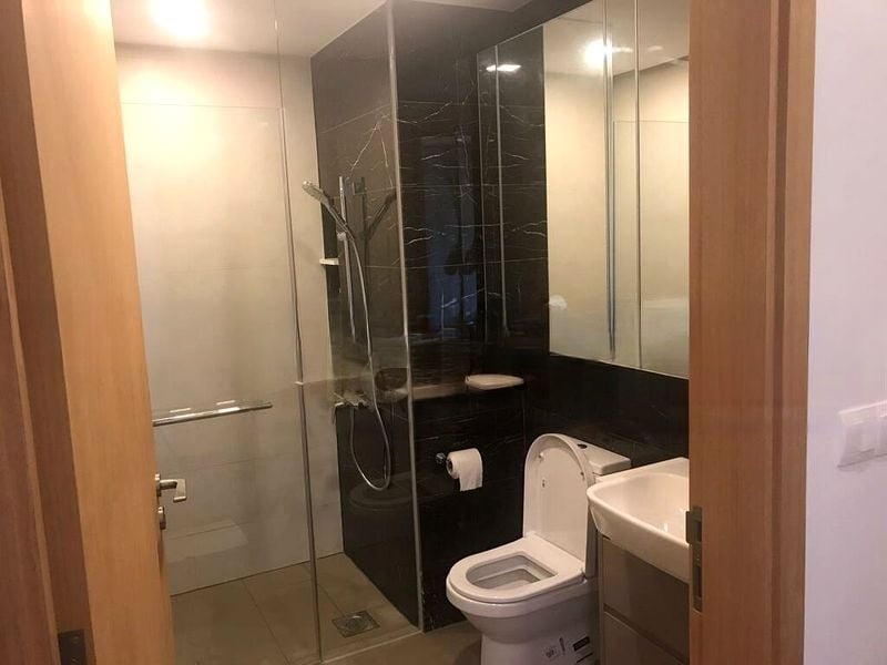 This thoughtfully designed layout features a seamless open-concept dining area, ideal for entertaining, alongside a modern kitchen equipped with a gas stovetop and built-in oven. The master bedroom boasts a large window adorned with sheer curtains, while the bathrooms are a luxurious retreat, showcasing elegant black marble tiles and a rain shower. With ample storage and a utility area for convenience, this unit is both functional and stylish.
