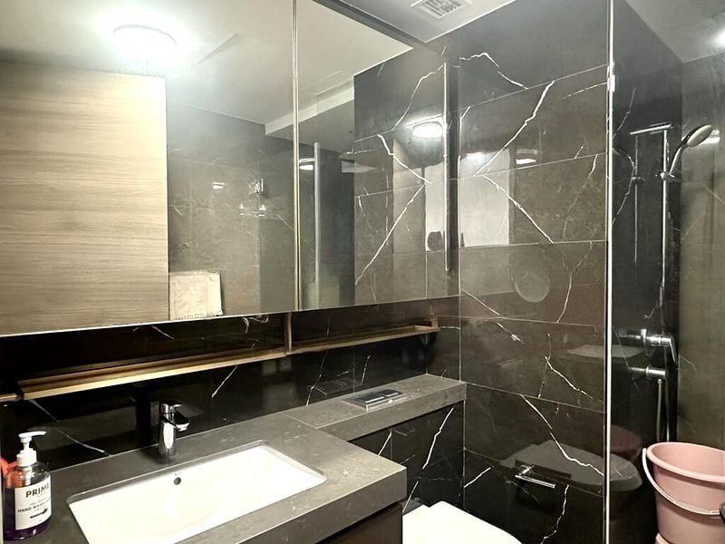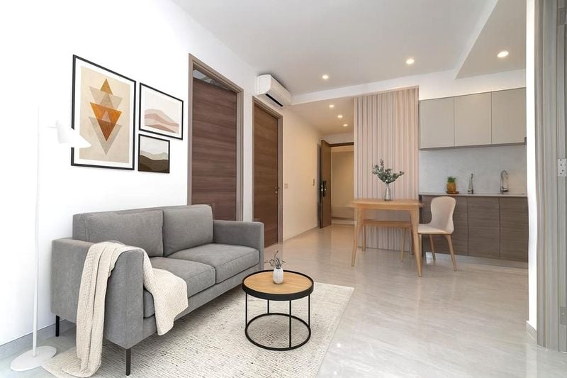 Step into a world of contemporary elegance as you enter this brand-new unit at The Florence Residences. Bathed in abundant natural light, the open-concept living area features a striking fluted wall paneling and designer furniture that creates a warm yet sophisticated ambiance. The light-colored tile flooring enhances the spacious feel, while large black-framed windows offer captivating views of the urban skyline.