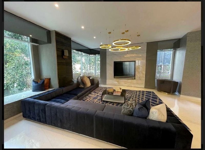 This well-maintained 3-bedroom, 3-bathroom condo boasts a spacious layout, featuring a large L-shaped navy velvet sofa in the living room, a round marble dining table beneath a stunning crystal chandelier, and a mirrored bar area perfect for entertaining. Each bedroom is thoughtfully designed, with custom geometric padded headboards and integrated study desks, ensuring both comfort and functionality. The full marble bathrooms, complete with separate bathtubs and double vanities, add a touch of opulence to your daily routine.