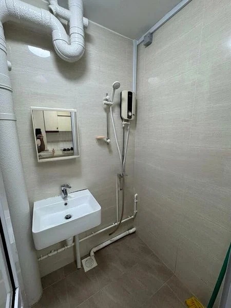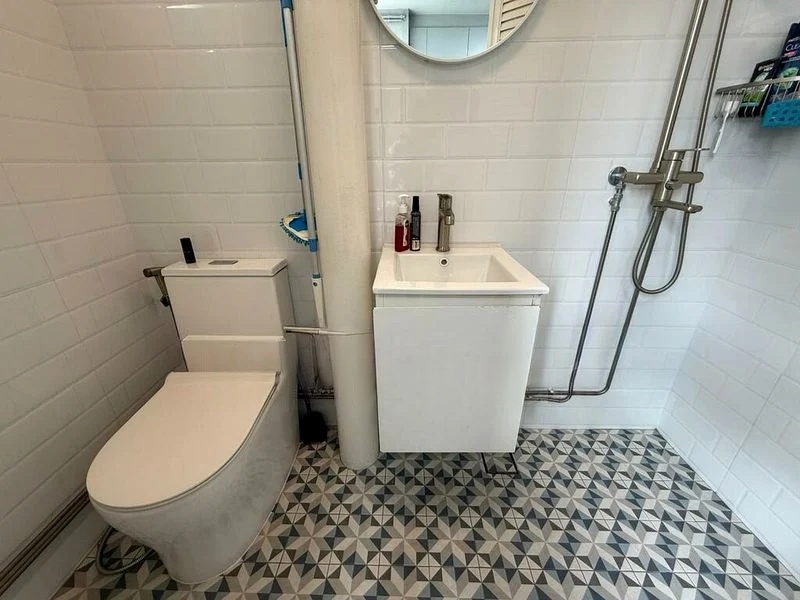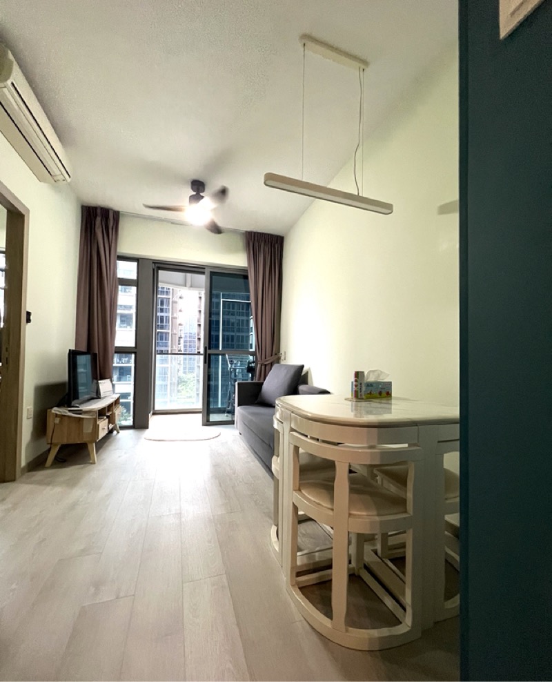 This thoughtfully designed 1-bedroom unit features an open-concept living area that connects effortlessly to the balcony, enhancing the spacious feel. The kitchen boasts integrated appliances, including an oven and washer, while the dining area showcases a stylish, space-saving nested dining set. The bathroom is a luxurious retreat, featuring marble-look wall tiles and a rain shower, ensuring comfort and elegance.