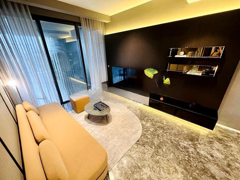 Step into a world of modern luxury as you enter this brand-new designer unit at 19 Nassim. The abundant natural light floods through floor-to-ceiling glass doors, illuminating the exquisite marble flooring and elegant wood-paneled walls. The open-concept living area, featuring a curved designer sofa and a large area rug, invites you to unwind while enjoying views of lush greenery and the inviting lap pool.