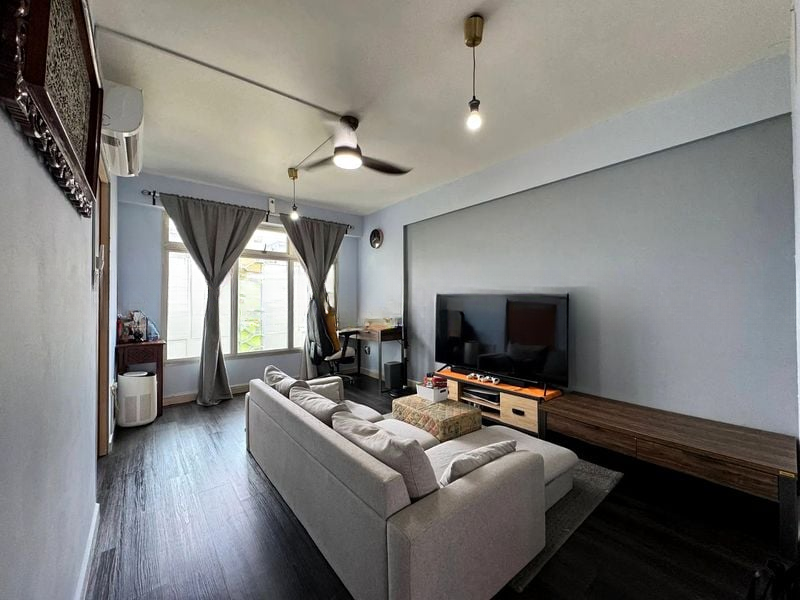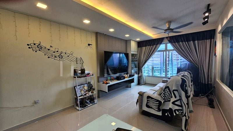 Step into this inviting 3-bedroom flat at 787E Woodlands Crescent, where modern aesthetics meet homely comfort. The green marble-patterned floor tiles create a striking first impression, complemented by the gentle illumination from the ceiling fan and split-unit air conditioning. Enjoy a cozy ambiance as natural light filters through the window grilles, offering a glimpse of the surrounding residential landscape.