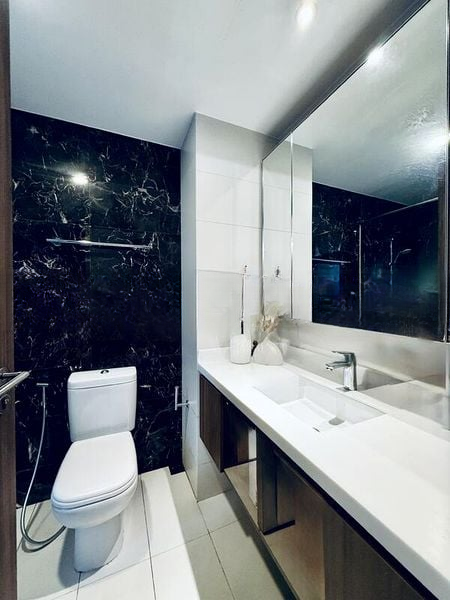 Step into this beautifully renovated 1-bedroom unit at Palm Isles and be greeted by an abundance of natural light that floods the open-concept living and dining area. The modern minimalist design is accentuated by large format white floor tiles and a stunning chandelier, creating an inviting ambiance that feels both spacious and sophisticated. Enjoy the seamless transition to the balcony, where urban views and greenery provide a refreshing backdrop.