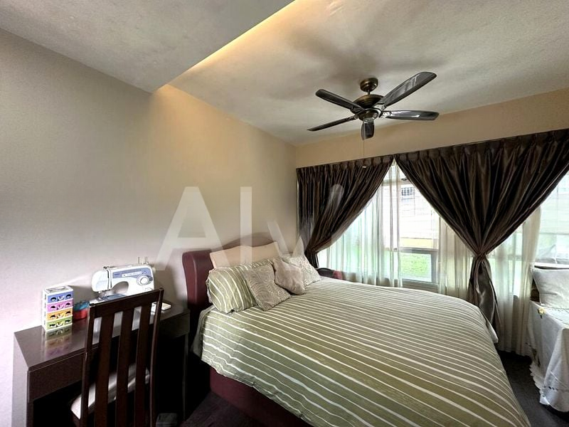 Step into a beautifully renovated 5-room flat that exudes warmth and functionality. The open-concept living and dining area welcomes you with marble-look floor tiles and cove lighting, creating a cozy ambiance that invites relaxation. Large windows frame views of lush greenery and neighboring residential blocks, filling the space with natural light and a sense of tranquility.