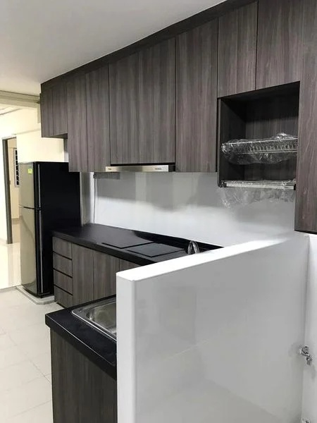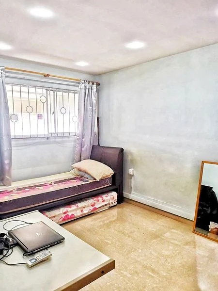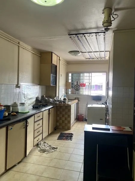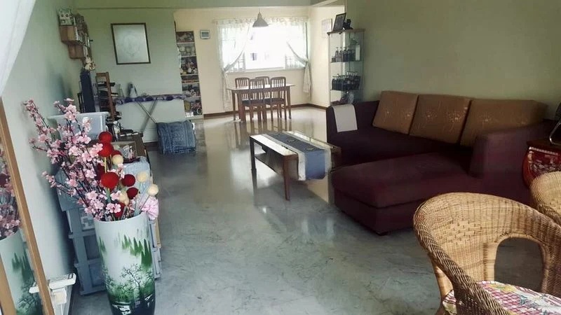 Step into a world of elegance as you enter this charming HDB unit, where traditional and ornate finishes greet you at every turn. The living room boasts marble-look tile flooring, adorned with floral armchairs and stained glass partitions that filter soft, natural light, creating a warm and inviting ambiance. The recessed ceiling with cove lighting adds a touch of sophistication, while views of neighboring residential buildings offer a sense of community.