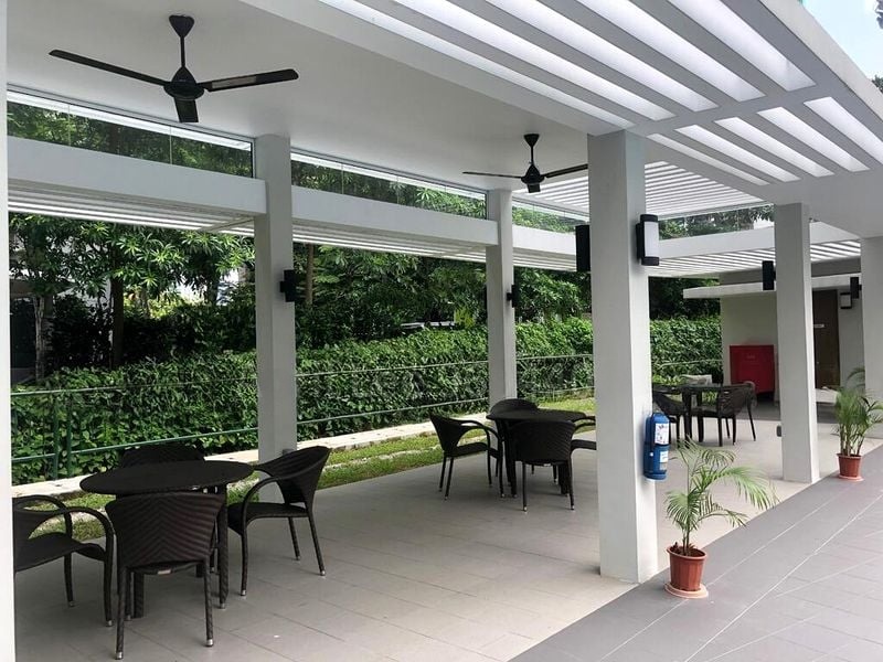 This unit boasts a generous layout, perfect for family living. Each bedroom comes with built-in wooden wardrobes, while the en-suite bathroom in the master bedroom adds convenience. The communal amenities are equally impressive, featuring a swimming pool, tennis courts, and outdoor BBQ areas, complemented by a sheltered pavilion with ceiling fans and a children's playground for family fun.