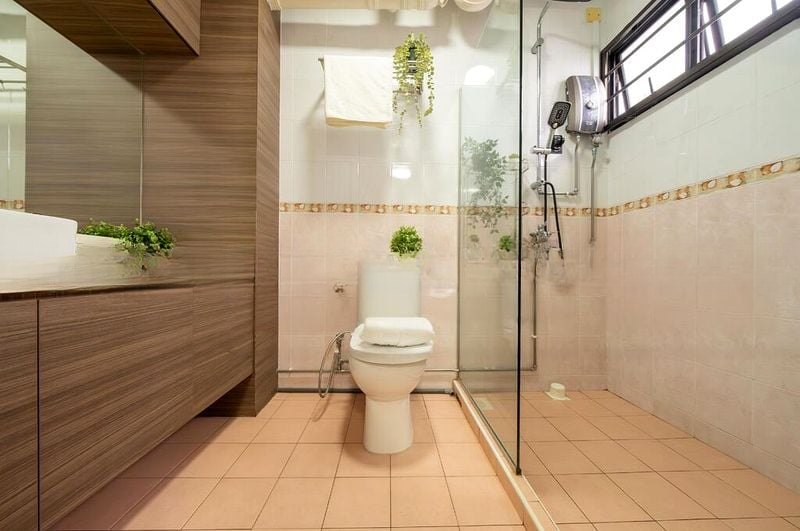 The living area flows seamlessly into the kitchen, featuring light-colored cabinetry and a gas cooktop, perfect for culinary enthusiasts. The bathrooms are equipped with modern glass shower partitions and charming floral wall tiles, while built-in wooden cabinetry in the bedrooms provides ample storage. With a floor area of 1475 sqft, this unit offers generous space for comfortable living.
