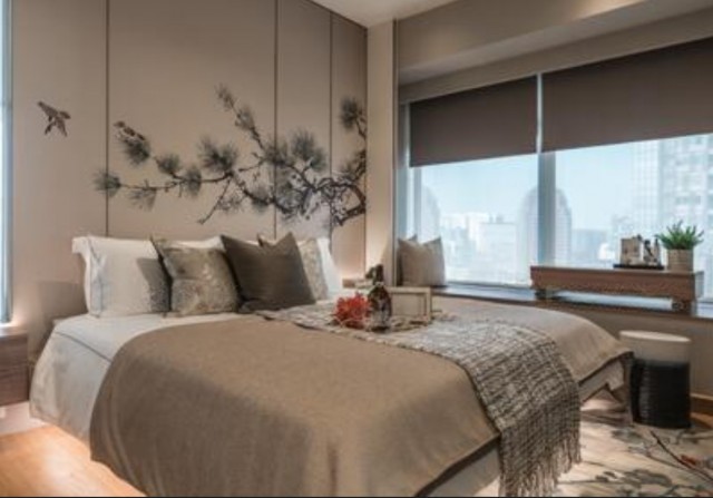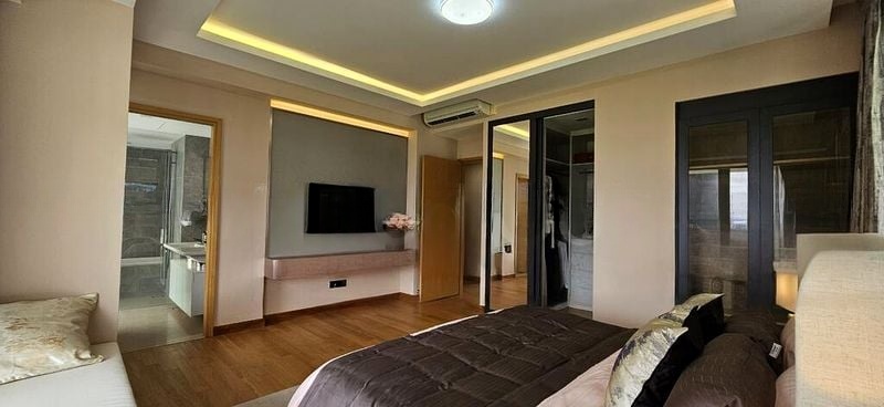 This spacious 2,432 sq ft layout boasts 4 well-appointed bedrooms, including a master suite with floor-to-ceiling mirrored wardrobes and sliding glass doors leading to the balcony. The U-shaped kitchen is a chef's dream, equipped with stainless steel appliances and ample storage in wood-grain cabinetry. The bathrooms are designed for relaxation, featuring a full-sized bathtub with a window view and modern finishes.