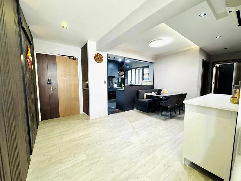 Step into a world of modern elegance as you enter this beautifully renovated 3-bedroom flat. The abundant natural light floods through large windows, highlighting the stunning marble-patterned feature wall and the sleek wood-look vinyl flooring. The ambiance is both inviting and sophisticated, perfect for relaxation or entertaining guests.