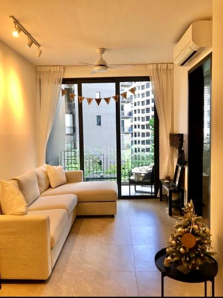 Step into a bright and airy sanctuary at Park Colonial, where abundant natural light floods the space, accentuating the sleek finishes and minimalist design. The living room, featuring an L-shaped sofa and track lighting, seamlessly connects to a private balcony that offers stunning views of the pool and lush greenery, creating a tranquil retreat right at home.