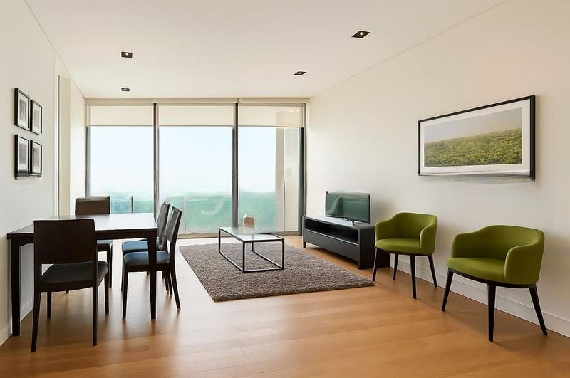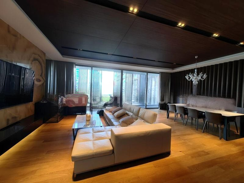 Step into a realm of modern luxury where abundant natural light floods the open-concept living space, accentuating the elegant dark wood-paneled ceiling and striking stone feature wall. Floor-to-ceiling windows frame breathtaking views of the lush greenery and urban landscape, creating a serene yet vibrant ambiance that invites relaxation and sophistication.