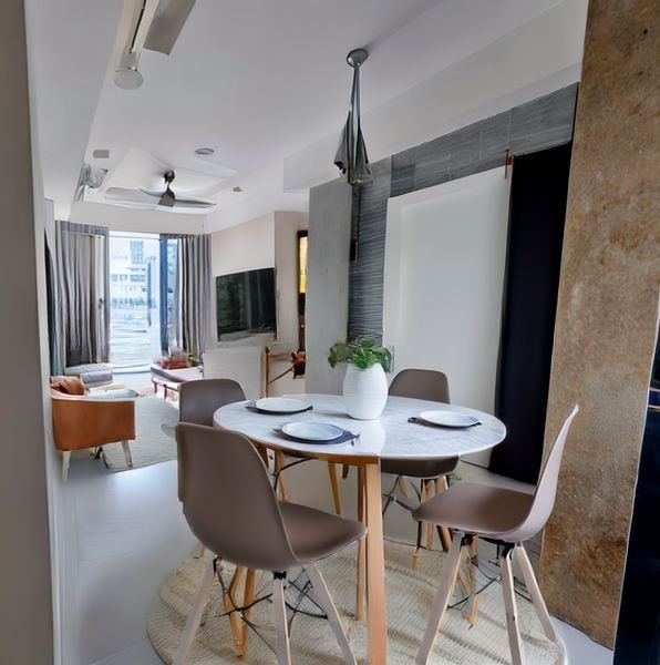 Step into this beautifully designed unit and be greeted by abundant natural light cascading through floor-to-ceiling windows, illuminating the sleek wood-paneled feature wall and modern finishes. The open-concept dining area, featuring a marble-top table and designer pendant lights, seamlessly flows into a contemporary kitchen adorned with marble-look countertops, creating an inviting ambiance perfect for entertaining.
