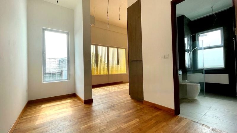 This brand-new home boasts five spacious bedrooms, each equipped with built-in floor-to-ceiling wardrobes and air conditioning for your comfort. The bathrooms are a highlight, featuring a luxurious rain shower, modern vanity cabinets, and stylish dark accent tiles. The expansive balcony, adorned with wood-look floor tiles, invites you to unwind and enjoy the outdoors in style.