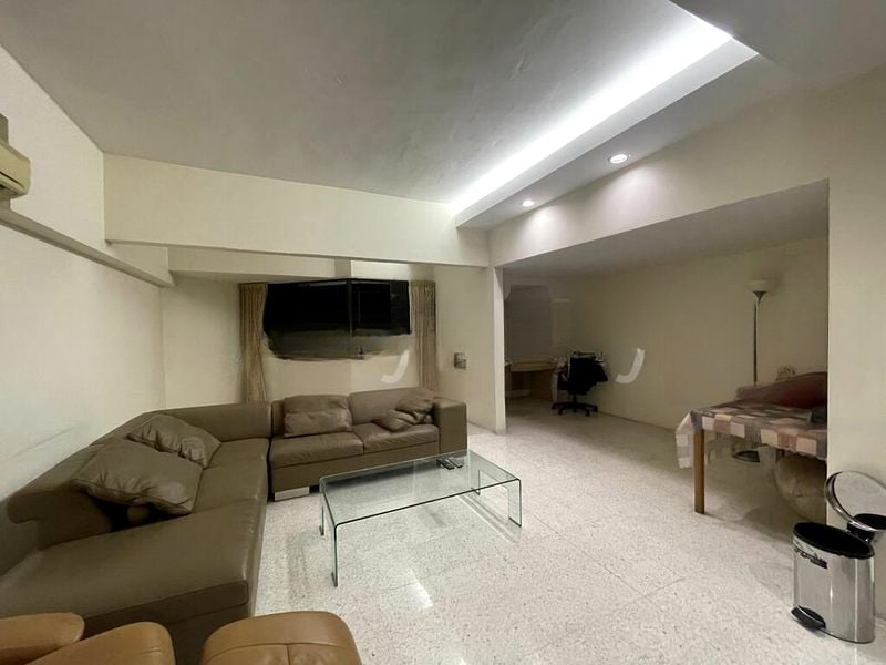 Step into a world of elegance as you enter this well-maintained 4-bedroom unit at Grange Heights. The spacious living area welcomes you with an L-shaped brown leather sofa, complemented by cove lighting and recessed spotlights that create a warm ambiance. The white tiled flooring adds a touch of sophistication, while the wall niche invites personal decor touches, making it a perfect space for relaxation and gatherings.