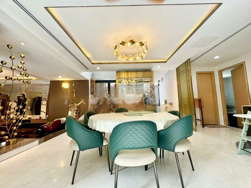 Step into a world of luxury as you enter this meticulously designed unit at Picardy Gardens. Bathed in natural light, the space exudes modern elegance with its dark marble flooring accented by decorative inlays. The stunning views of the pool and neighborhood create a serene ambiance, complemented by swan-shaped pendant lights and multiple crystal chandeliers that add a touch of sophistication.