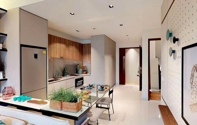 The thoughtfully designed layout boasts a fully-equipped kitchen with integrated appliances, a stylish dining area with a glass table, and a cozy living room perfect for relaxation. The master bedroom is a highlight, featuring a built-in headboard with LED lighting and designer wall sconces, while the bathroom impresses with marble-look tiles and a contemporary vessel sink. Every corner of this home reflects a modern minimalist ambiance that is both inviting and functional.