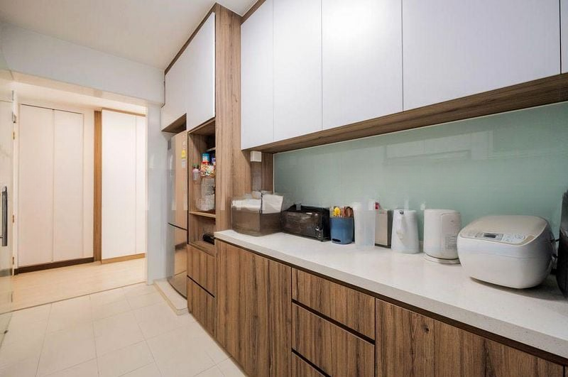 The layout features an L-shaped kitchen with dark wood cabinets and a stainless steel refrigerator, perfect for culinary enthusiasts. Each bedroom is designed for comfort, with large windows offering views of the surrounding HDB blocks and ample built-in storage. The bathrooms are elegantly finished with white wall tiles and modern fixtures, ensuring a practical yet stylish experience.