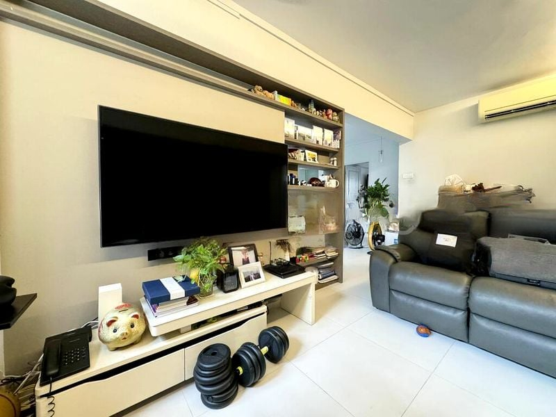 Step into this well-maintained 3-bedroom HDB flat and be greeted by a spacious living area adorned with a stunning mirrored feature wall and decorative pillars. The white tiled flooring reflects the natural light, creating a bright and inviting ambiance that feels both traditional and functional. Enjoy the comfort of ceiling fans in every room, enhancing the airy feel of the space.