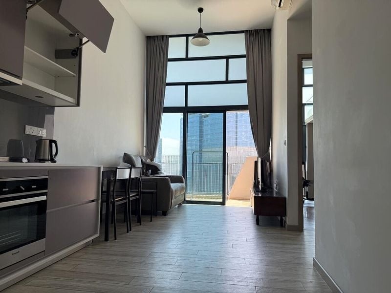 This well-maintained 2-bedroom, 2-bathroom unit features high ceilings and a unique loft bed in the second bedroom, maximizing space and functionality. The kitchen boasts sleek grey cabinetry and a built-in oven, perfect for culinary enthusiasts. Enjoy the luxury of modern wood-look tiles throughout, complemented by stylish track lighting that enhances the contemporary feel.