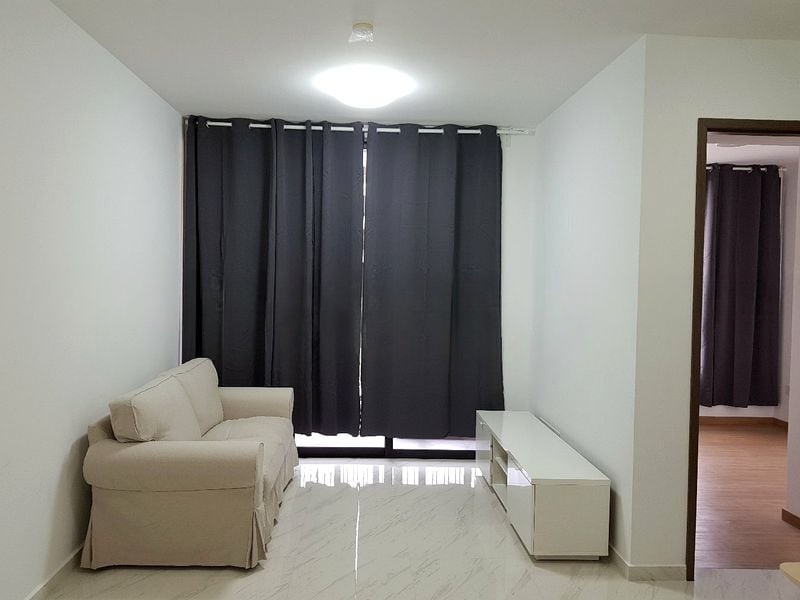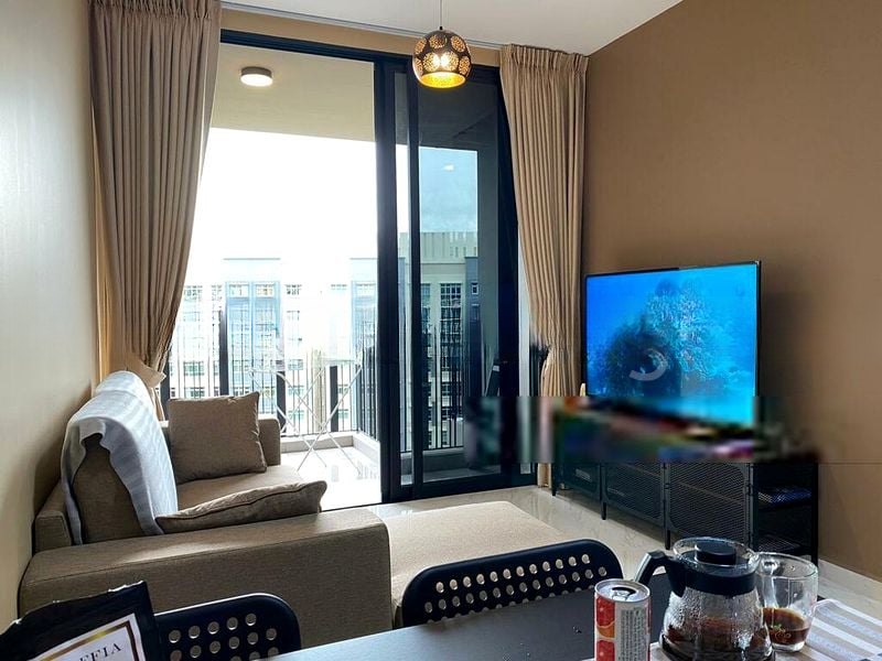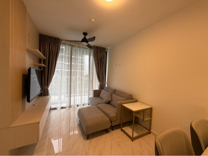 Step into a world of modern elegance as you enter this brand-new 2-bedroom unit at LE QUEST. Bathed in natural light, the open-plan living area features sleek marble-look floor tiles and black track lighting, creating a sophisticated ambiance. The full-height windows invite breathtaking views of the pool and city skyline, while the balcony offers a perfect spot to unwind amidst lush greenery.