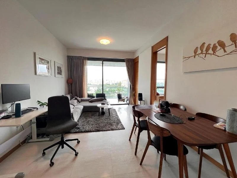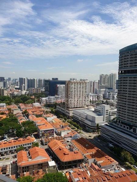 Step into a bright and airy sanctuary at Concourse Skyline, where abundant natural light floods the space, highlighting the polished tile flooring and elegant finishes. The panoramic views of the city skyline and serene water create an inviting ambiance, complemented by the greenery and traditional shophouses visible from the glass-railed balcony.