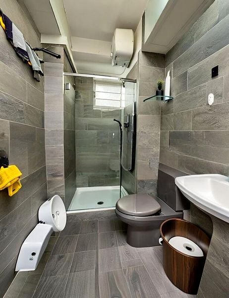 This well-maintained flat boasts three spacious bedrooms, including a master suite with a stylish bathroom featuring grey wood-textured tiles and a glass shower partition. The galley kitchen is a chef's dream, complete with light wood grain cabinetry, a striking black marble backsplash, and integrated LED lighting. Each room is thoughtfully designed to maximize space and comfort, making it perfect for families or those seeking a modern lifestyle.